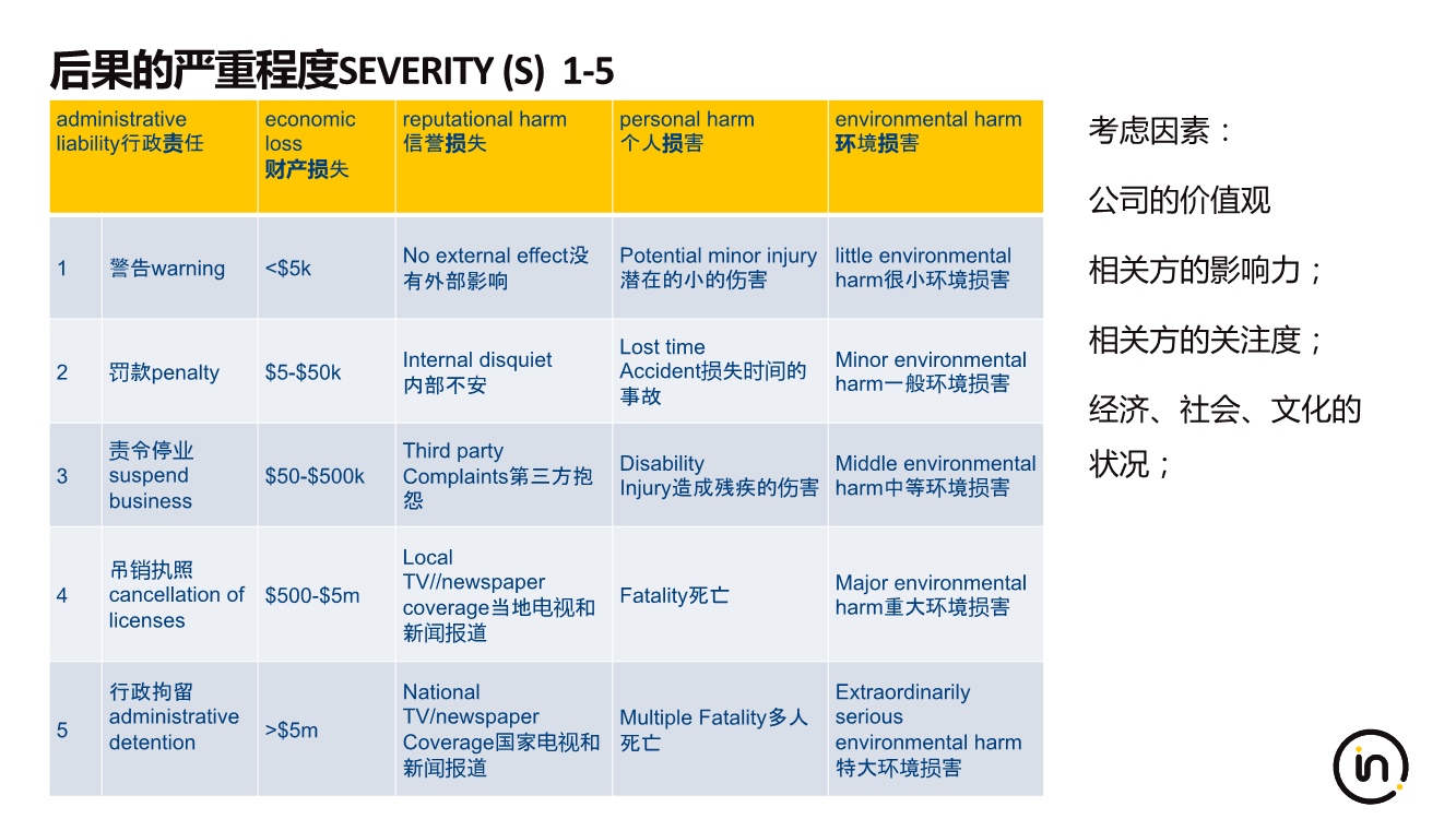 各個管理體系都是建立在風險管控的基礎上的,而不同的管理體系正如前面所說側重點有所不同。雖然各個管理體系涉及的風險都需要管控,但是這些風險對于企業的影響和重要程度不同。我們不能一味的強調某個管理體系的重要性,而忽視了各管理體系為企業整體戰略目標服務的宗旨。因此如圖二所示,在考慮后果的嚴重程度時,要考慮風險事件對各利益相關方的影響,例如綜合考慮行政責任、財產損失、信譽損失、個人損害、環境損害等,權衡不同相關方的利益和對企業的重要性,統一風險評價準則,將這些不同管理體系涉及的風險進行統一的排序,然后根據風險程度的不同和優先順序確定管控的優先順序、資源的投入和管控的力度,從而實現企業整體管理績效最優。