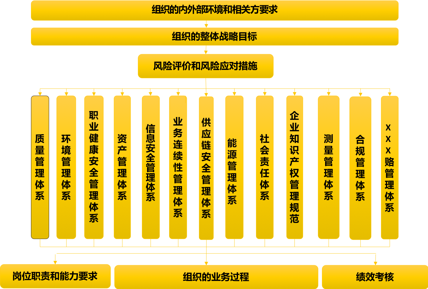 如圖一所示,企業戰略目標的實現必須通過策劃和實施主要的核心業務過程(如:針對產品和服務的要求、設計開發、采購、生產和服務提供、產品和服務的放行、不合格品輸出的控制),保證產品實現過程實施所必須的一些支持性過程(資源、能力、意識、溝通、文件化信息),以及這些產品實現過程和支持性過程有效實施的管理過程(如:內外部環境分析、相關方要求識別、方針、目標、風險管控、監視測量分析評價、內審、管理評審等)。確保這些過程的有效實施是管理體系的核心和基礎。不管是安全問題、環境問題、信息安全問題、合規問題等都是因為企業的這些產品、服務和產品和服務提供的活動產生的,因此各管理體系的要求歸根到底要管控這些問題,為這些過程有效實施服務。同時我們應該明白各崗位人員不可能也沒有必要了解和掌握所有管理體系要求,他們只需要按照各自崗位涉及的過程的程序和工作標準要求進行工作就可以了。因此將各管理體系的要求和風險控制措施整合進入企業的業務活動過程,運用過程方法,提高主要過程能力和有效性。